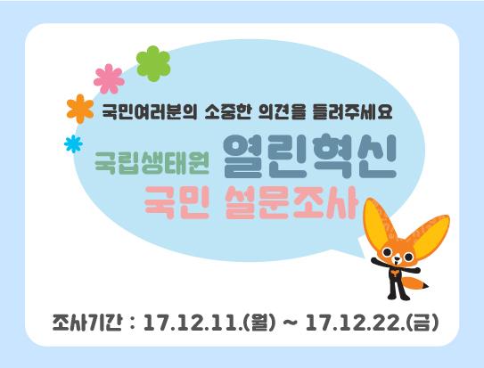 ◎ 국립생태원에서는 "열린혁신" 추진을 통해 국민과 함께하는 열린 공공기관으로 거듭나기 위하여 국민여러분의 소중한 의견을 듣고자 하오니 설문조사에 응하여 주시면 감사하겠습니다.