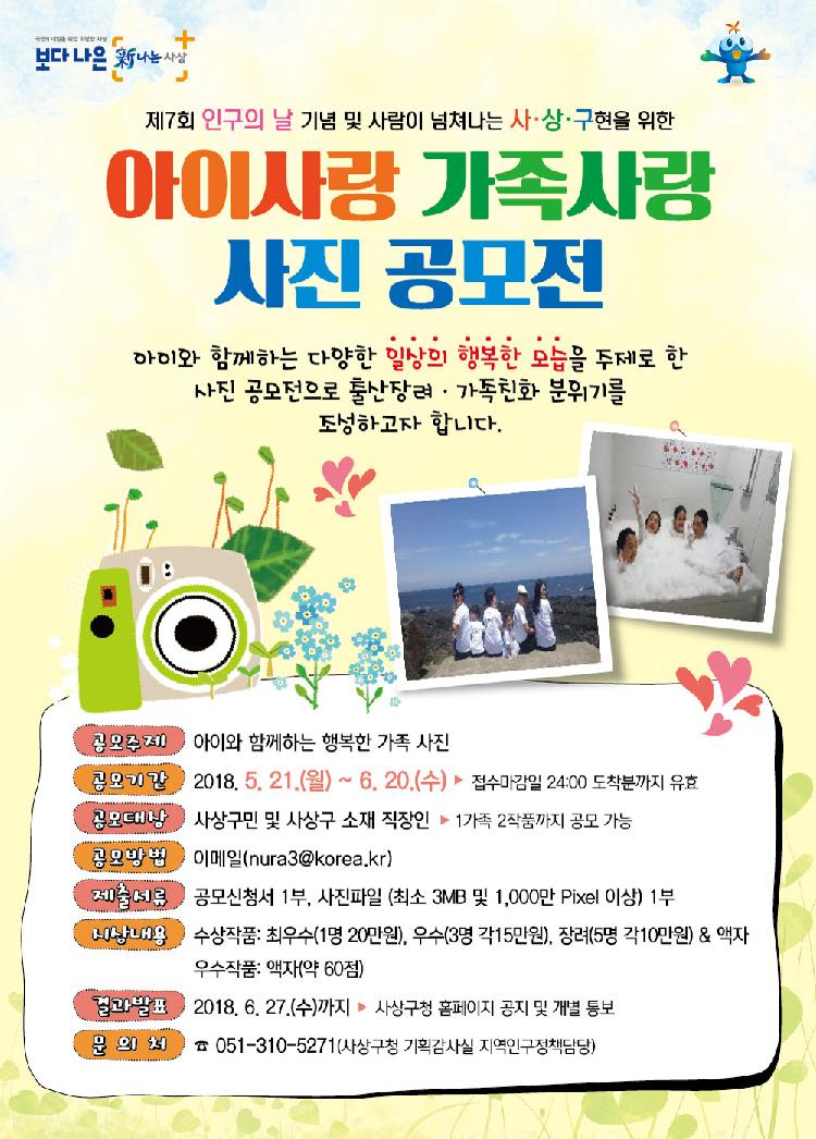 제7회 인구의 날 기념 및 사람이 넘쳐나는 사·상·구현을 위하여 『제2회 아이사랑 가족사랑 사진 공모전』을 다음과 같이 개최하오니 많은 참여 바랍니다.