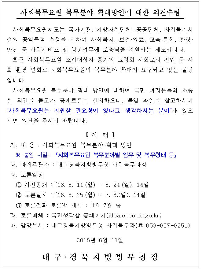 사회환경 변화 등을 고려하여 '사회복무요원 복무분야 확대방안'에 대하여 다양한 의견을 주신 국민 여러분께 감사드립니다.