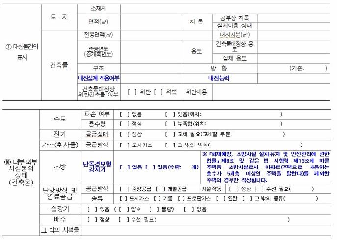 <개정된 시행규칙에 따른 중개대상물 확인, 설명서 : 건물의 내진성능과 경보장치 유무 항목 추가>