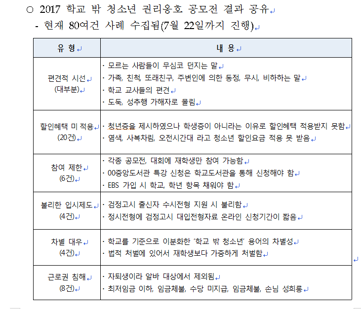 한국청소년상담복지개발원에서 학교밖청소년권리옹호공모전 중간내용입니다. 많은곳곳에서 편견이 있었음을 알수 있는 내용들이 공모전을 통해 볼수 있었습니다. 이러한 편견가 침해들이 없는 그날까지 우리 국민디자인단과 국민들이 지혜를 모야야 할 때입니다.