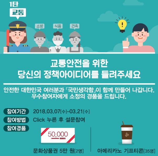국민생각함에서는 4대 생활안전 분야(교통,건설,소방,식품)에 대한 국민여러분의 의견을 수렴하고자 상반기에 위 분야에 대한 '생활안전 정책 아이디어 공모전'을 개최하고자 합니다.