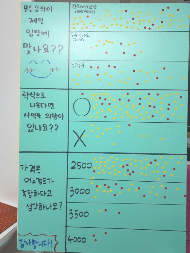- 음식을 시식한 후 학생들의 생각을 스티커판에 붙이도록 하여 학생니즈조사를 실시