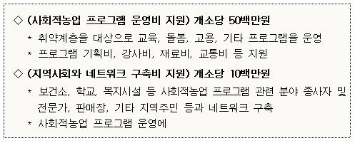 특히, 농식품부는 올해부터 시범사업으로 사회적 농업 실천 조직에 대해 프로그램 운영비, 네트워크 구축비를 지원하고 있습니다.