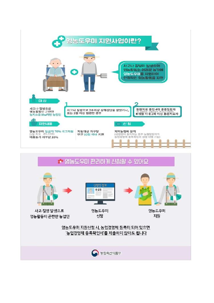 이와 더불어, 농촌 지역 사고 질병 농가의 체감적인 사업 효과를 위해 영농도우미의 사업 개선사항은 어떤 것들이 있을까요? (아래 인포그램의 사업내용을 참고하시면 됩니다.)