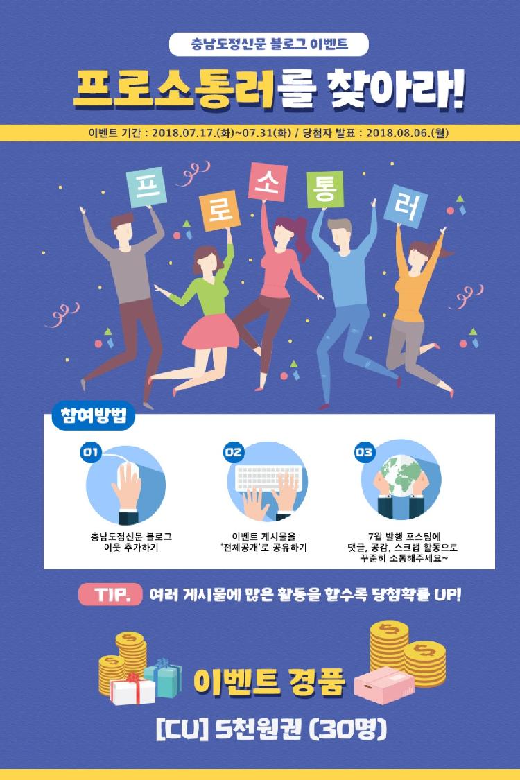 충남도정신문 블로그 도란도란에서 '프로소통러를 찾아라!' 이벤트를 실시합니다. 추첨을 통해 30분께 'CU 5천원권'을 드리오니 많은 참여를 부탁드립니다.