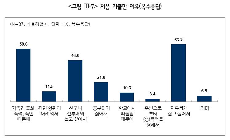 처음 가출한 이유로 '자유롭게 살고 싶어서'가 63.2%인 반면, '가족간 불화,폭력, 폭언'을 이유로 꼽은 사람들이 58.6%로 나타났습니다.
