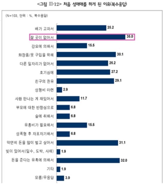 처음 성매매를 하게 된 이유로 '잘 곳이 없어서'가 35%로 가장 많이 꼽혔습니다. 청소년 입장에서 돈이 필요하고, 당장 잘 곳이 없기 때문에 성매매를 한다는 것을 알 수 있습니다.