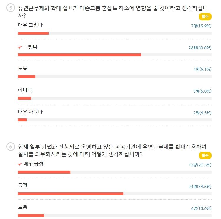 대기업과 공공기관에 확대적용하여 실시를 의무화함으로써 유연근무제의 효과를 극대화하는 데 긍정적인 답변이 많았습니다. 유연근무제를 확대실시하게 된다면 시차출퇴근형, 근무시간선택형 등의 유형과 부서, 직종별 혹은 전체에 이르는 적용범위, 그리고 시간대를 고려해야 합니다. 또한 유연근무제의 적극적인 실시를 위해 업무효율성 확보, 고용안정성 확보 등의 문제를 해결하기 위한 대응책이 필요합니다.