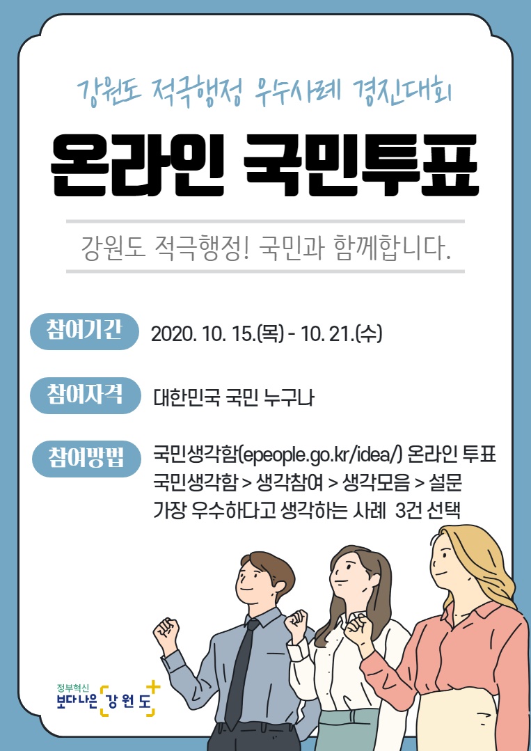 ... 사회보장 정보서비스를 통해 맞춤형 복지를 실현하고 국민 행복에 기여하기 위해 노력한 2025년 혁신 사례를 공유합니다.이 중 국민투표를 통해 Top5 사례를 선정하고자 하오니 가장 우수하다고 생각하시는 사례 3건에 투표해 주세요.참여하신분 중 무작위 추첨(20명)을 통해 5천원 상당의 모바일 쿠폰을 드리는 이벤트도 진행중이오니 많은 관심과 참여 바랍니다.ㅇ ...