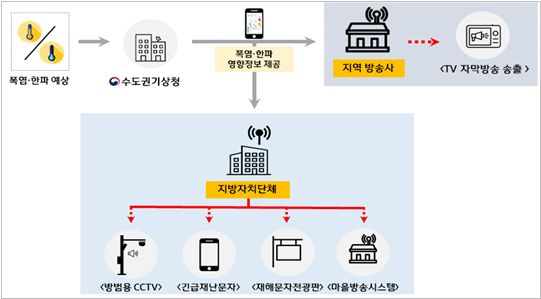 지방자치단체, 지역방송사 등과 협업으로 다양한 벙법*으로 폭염ㆍ한파 영향예보를 지역민에 전달(서비스: '21.5.부터)