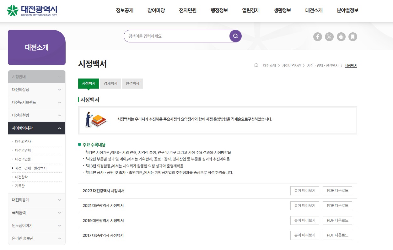 - 시정백서 홈페이지: 대전광역시 홈페이지 > 대전소개 > 사이버역사관 > 시정/경제/환경백서