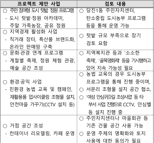 ○ 그러나 『탄소중립 텃밭 정원 프로젝트』 제안서의 주요 사업의 실현 가능성을 검토해 보면 아래와 같음.