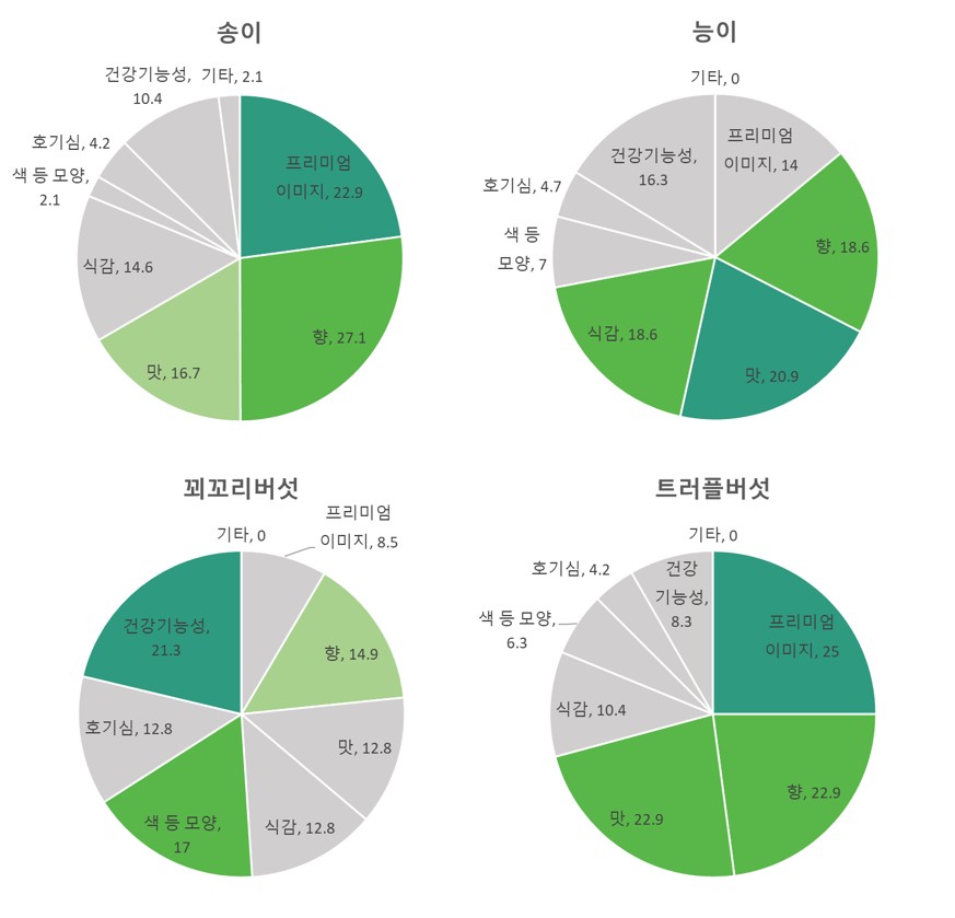 송이(18%), 능이(21%), 꾀꼬리버섯(21%), 트러플(21%)을 선택해주셨습니다.