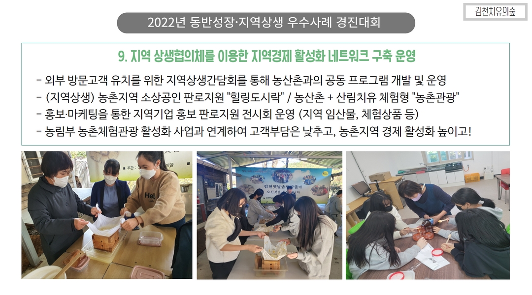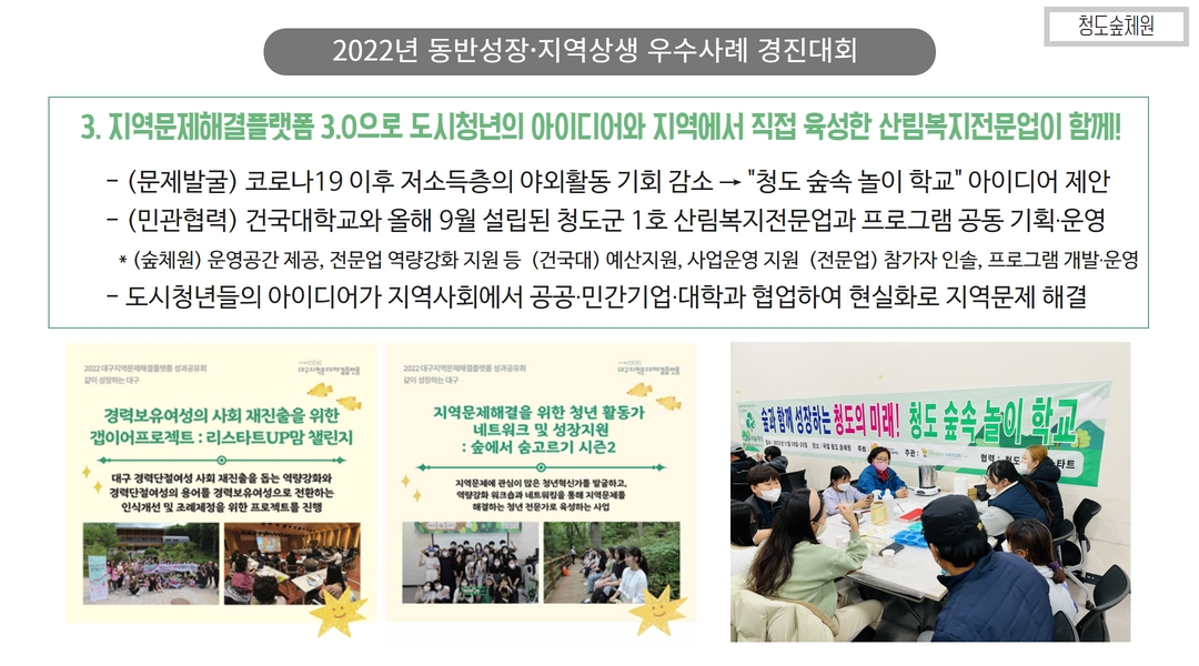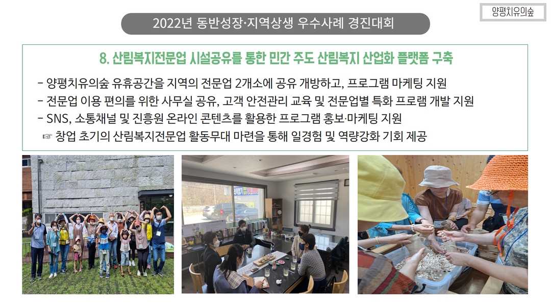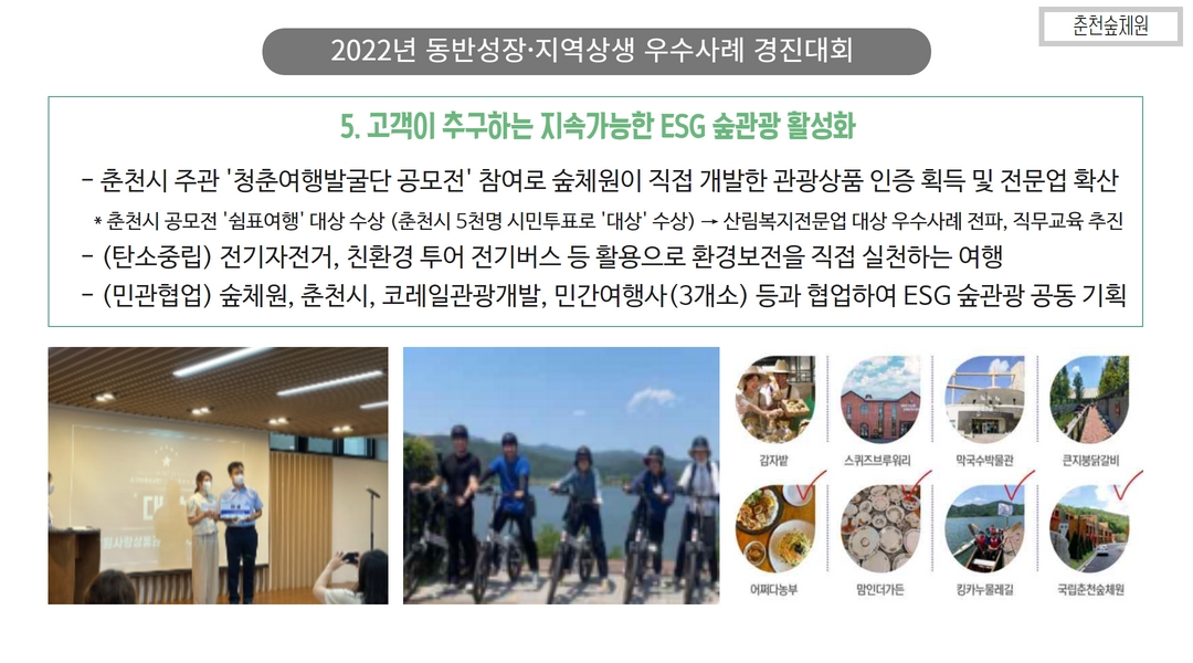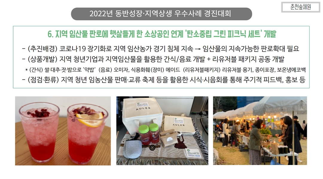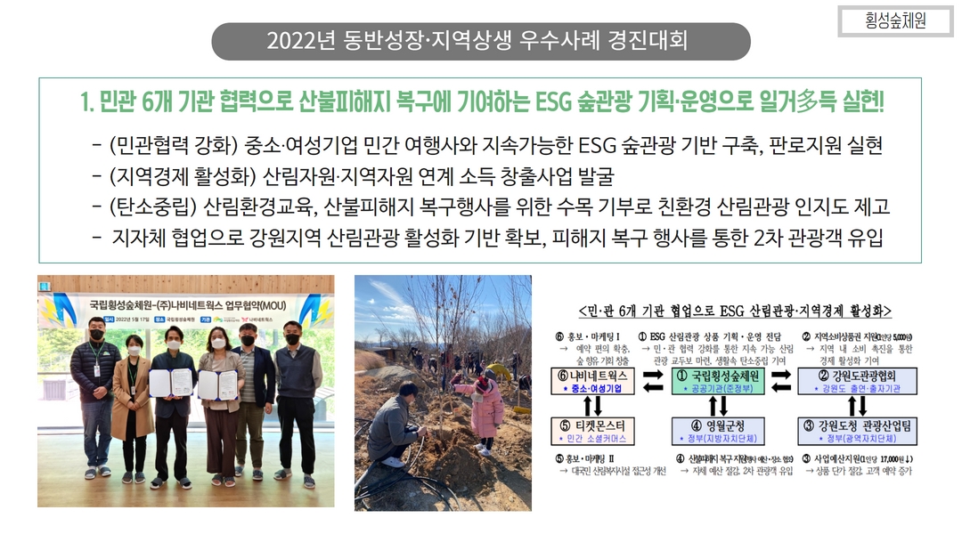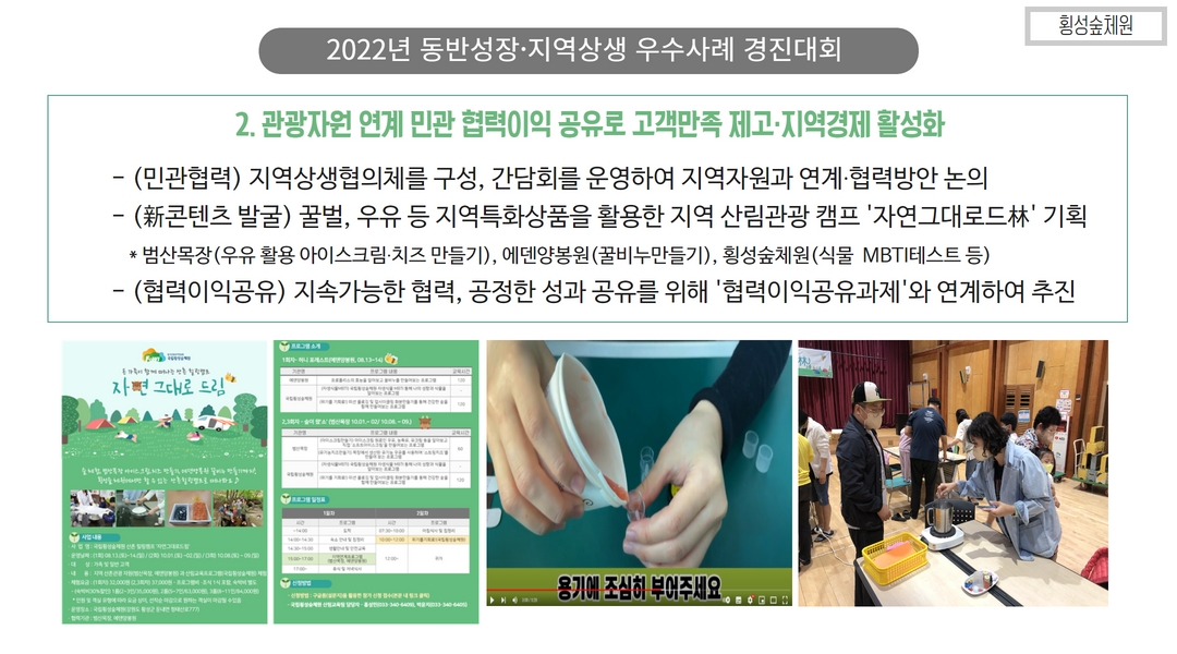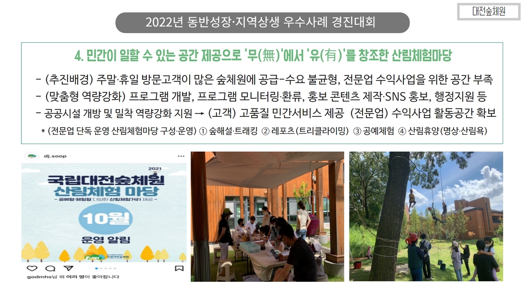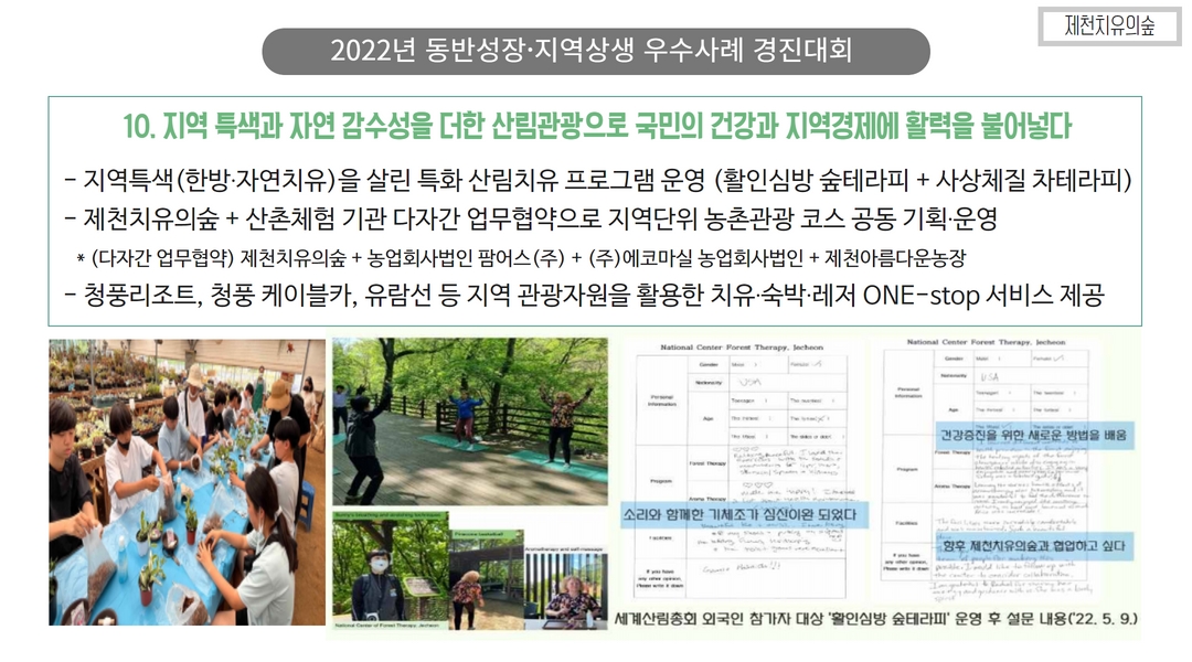 ... 기술 고도화 및 수출 지원도 필요합니다.4. 산림복지 및 지역관광 연계 플랫폼 강화 산림을 활용한 ... 힐링센터 등은 그 좋은 예가 될 것입니다. 산림복지와 관광, 로컬푸드, 지역 농림축산물 등을 연계한 ‘산촌 복합문화플랫폼’ 구축이 필요합니다.5. 산림 공익 가치에 대한 시장화 전략 탄소흡수, 수자원 보호, 생물다양성 유지 등 산림의 공익적 기능을 보상 가능한 ...